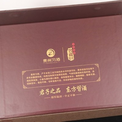 白酒精品包裝盒印刷清晰,外形美觀,簡單大氣精品白酒包裝盒,材質上使用質優灰板加銅版紙。表面圖案使用德國進口海德堡印刷機加工印刷,外觀圖案為原創設計,外觀簡潔大方。盒內為植絨加珍珠棉,高端上檔次。