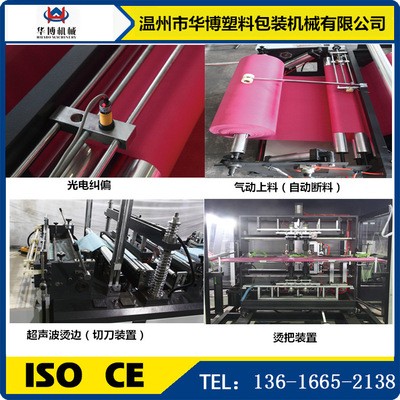 1.該機(jī)適用原材料為無紡布,能加工各種不同規(guī)格,不同型狀的無紡布穿皮筋袋、穿繩袋、平口袋等,該機(jī)集機(jī)電為一體,運(yùn)用LCD觸摸屏操作。配以步進(jìn)步式定長(zhǎng),光電跟蹤,電腦自動(dòng)定位,電腦自動(dòng)糾邊,準(zhǔn)確,平穩(wěn),自動(dòng)計(jì)數(shù),即可設(shè)定計(jì)數(shù)報(bào)警,自動(dòng)打孔,自動(dòng)燙把手等工控裝置,使其生產(chǎn)的成品封線牢固,切線美觀。高速效,是你可以放心適用的環(huán)保型制袋設(shè)備。